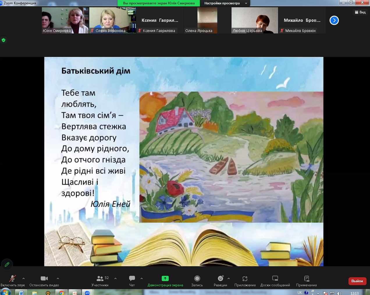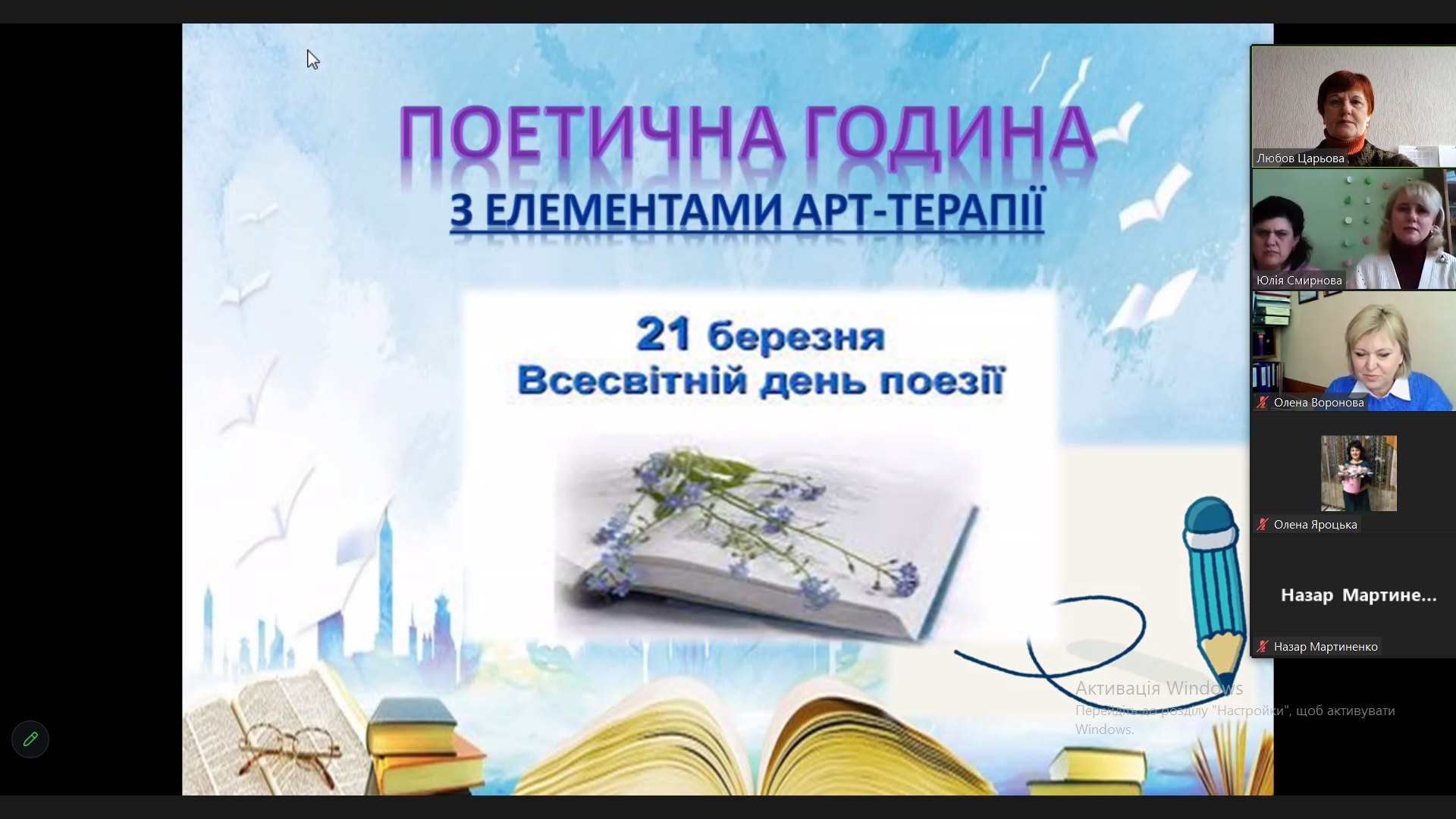 «Поетична година з елементами арт-терапії» - таку назву мав захід, підготовлений бібліотекарями Юлією Смирновою та Наталією Пилипенко разом зі студентами 18 групи відділення харчових технологій (куратор Олена Яроцька) та практичним психологом Оленою Вороновою, до Всесвітнього дня поезії. На онлайн-зустріч були запрошені студенти других курсів. Саме зараз по всій Україні проходить Національний тиждень читання. Тиждень поезії . Тема якого – «Дім».