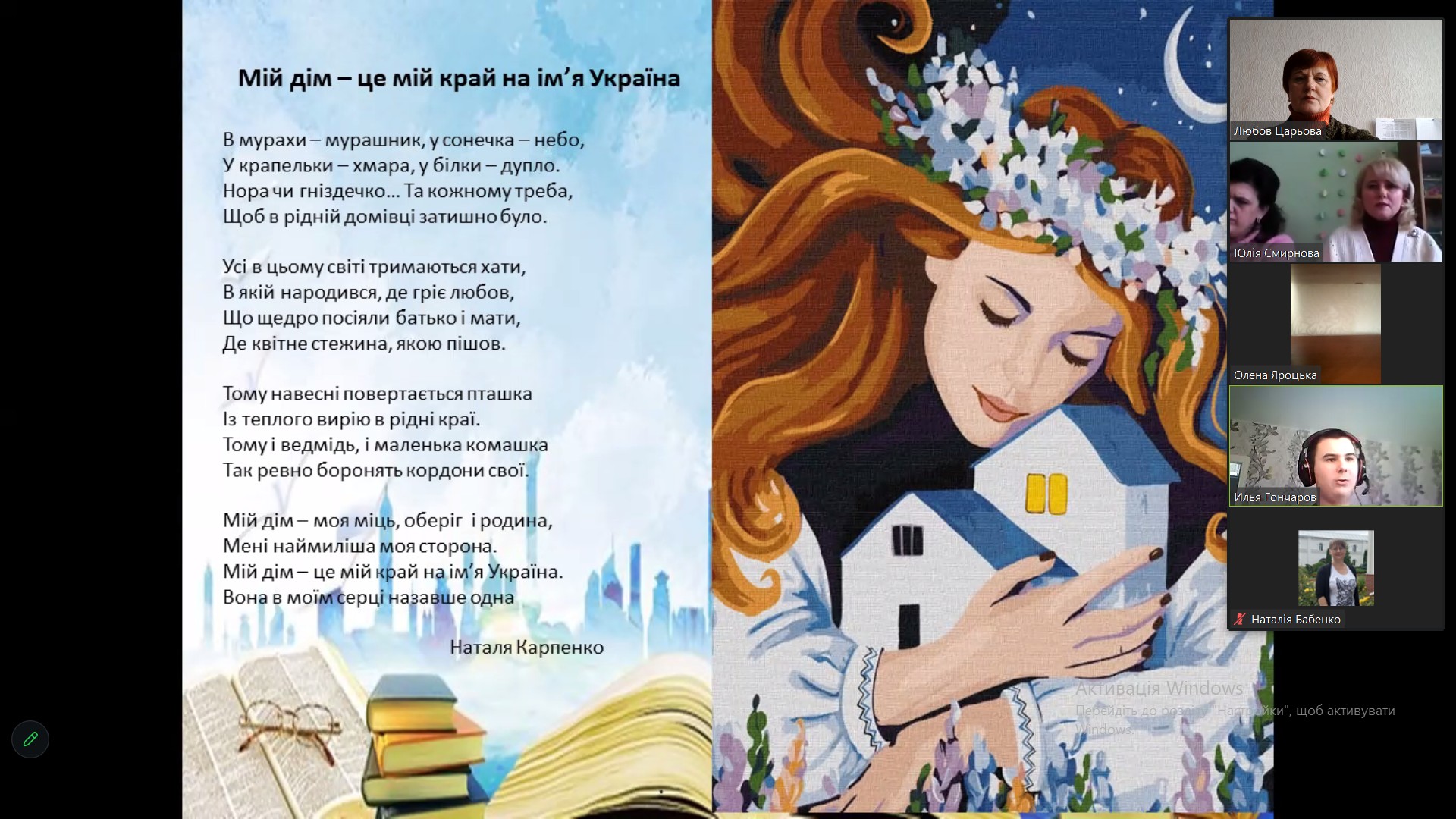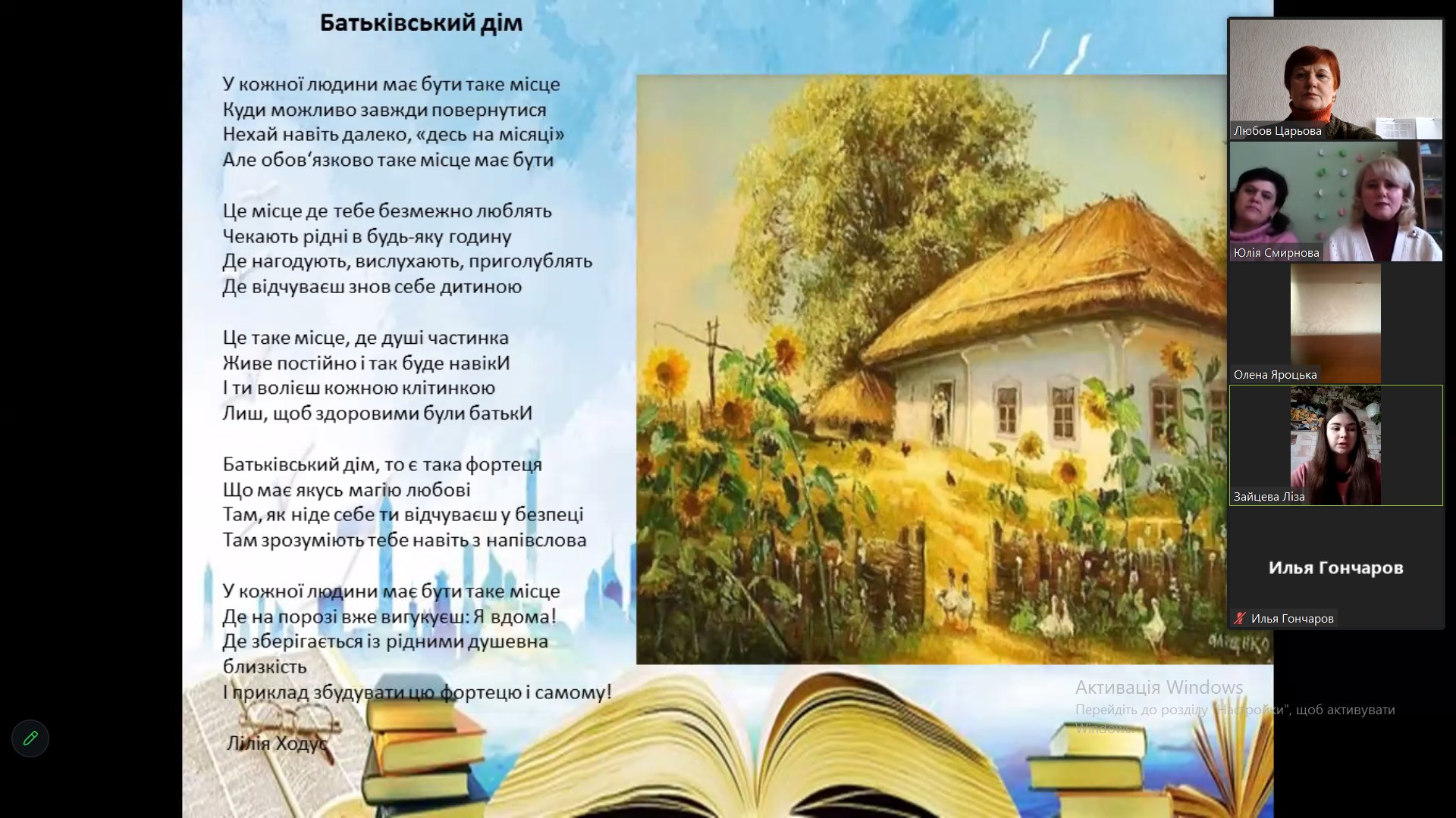 Студенти Зайцева Ліза, Приходько Захар, Гончаров Ілля та Грищенко Тетяна прочитали прекрасні, щемкі вірші присвячені батьківському дому, рідному краю. Дім тепер для кожного українця більше, ніж просто позначка на мапі. Не лише стіни і дах, але й місце - де насичені теплом спогади. Дім – це наша фортеця, наша родина . Досить болюча тема для молоді Сумщини, яка останнім часом потерпає від постійних обстрілів та бомбардувань. Тож, мистецтво поетичного слова має терапевтичний ефект.
