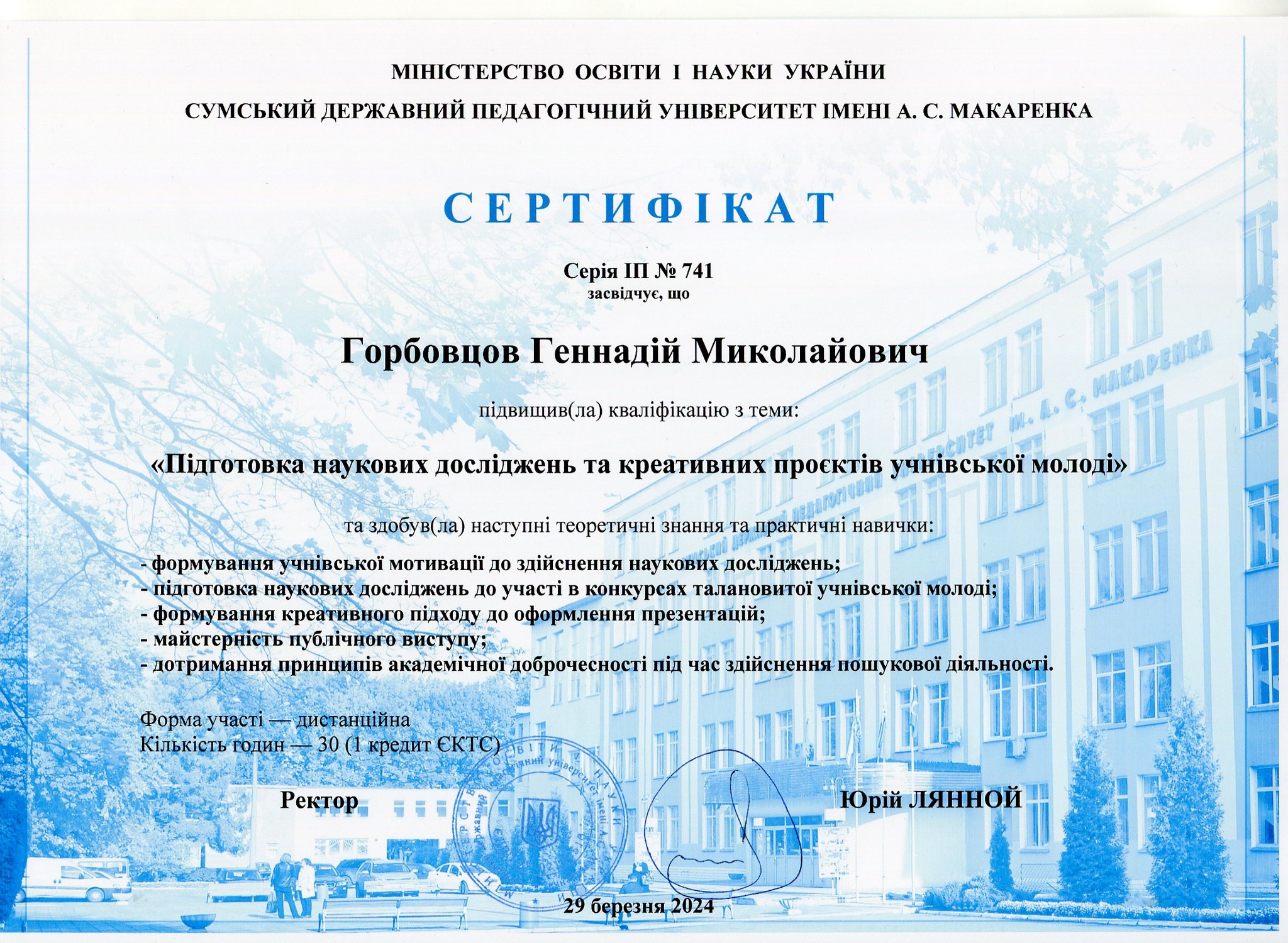 Керівник проєкту викладач географії Г. Горбовцов отримав сертифікат про підвищення кваліфікації з теми «Підготовка наукових досліджень та креативних проєктів учнівської молоді».
