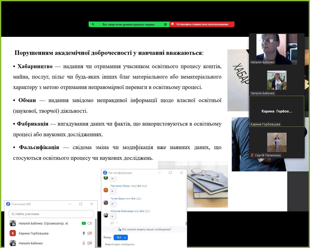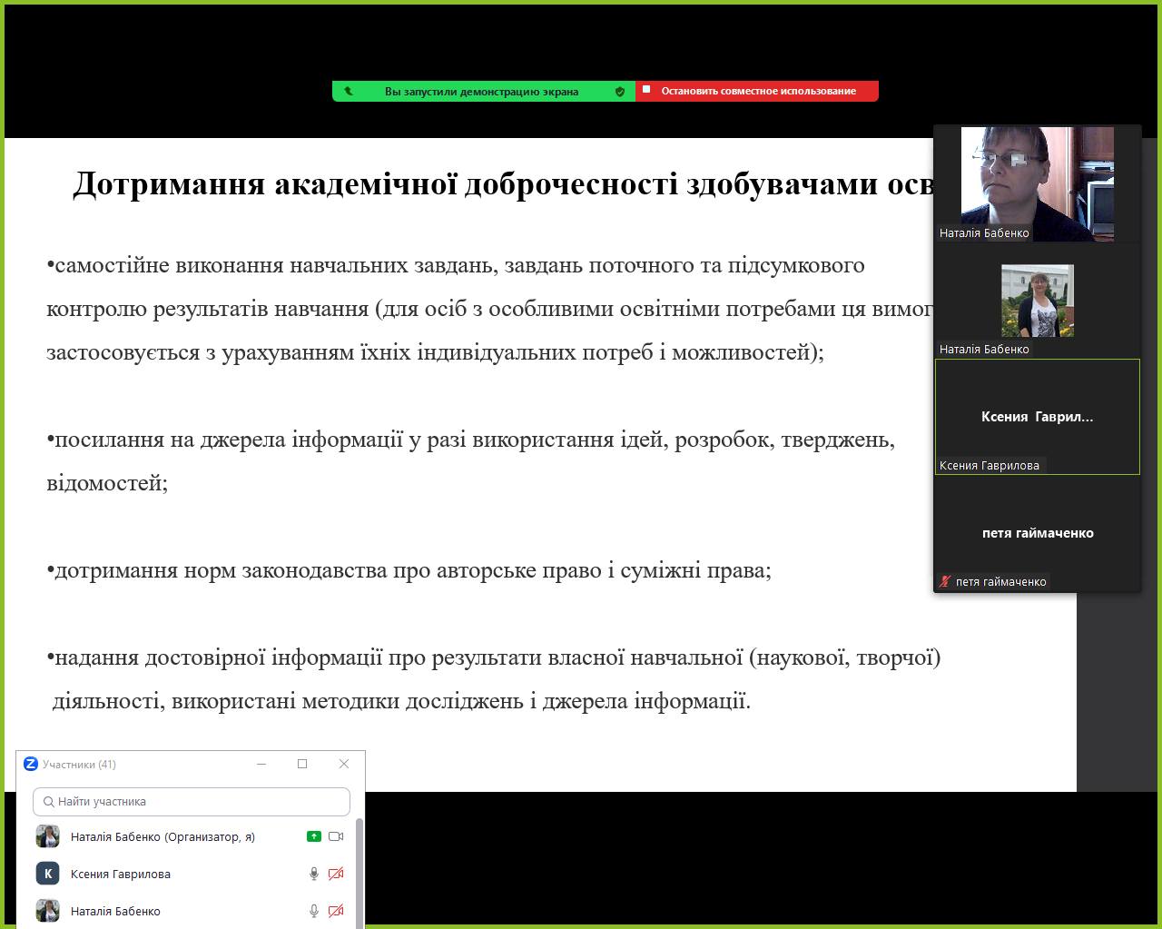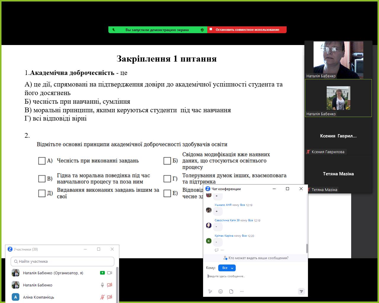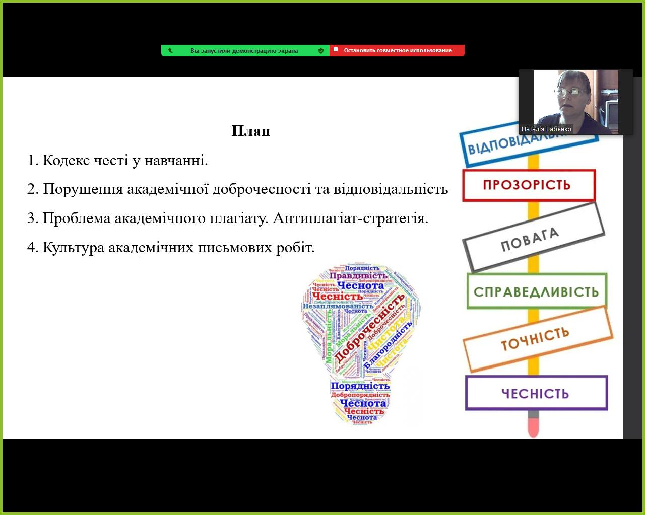 Сьогодні студенти 3-го курсу Гаврилова Ксенія, Горбовцова Карина (34 гр.) та Соловйова Дар'я, Савостіна Катерина (39 гр.) економіко-правового відділення (куратор Наталія БАБЕНКО) підготували виховну годину на тему "АКАДЕМІЧНА ДОБРОЧЕСНІСТЬ СТУДЕНТА" і запросили на неї студентів інших відділень коледжу.Дізналися, що таке академічна доброчесність, чому це поняття стосується кожного, розібрали, якою є відповідальність за академічну недоброчесну поведінку, наголосили на правильності написання письмових робіт. Після кожного розглянутого питання, студенти могли перевірити засвоєння інформації. На завершення зустрічі переглянули відео від блогерки про 5 небхідних кожному навичок. Впевнені, що студенти нашого коледжу дотримуються правил академічної доброчесності!