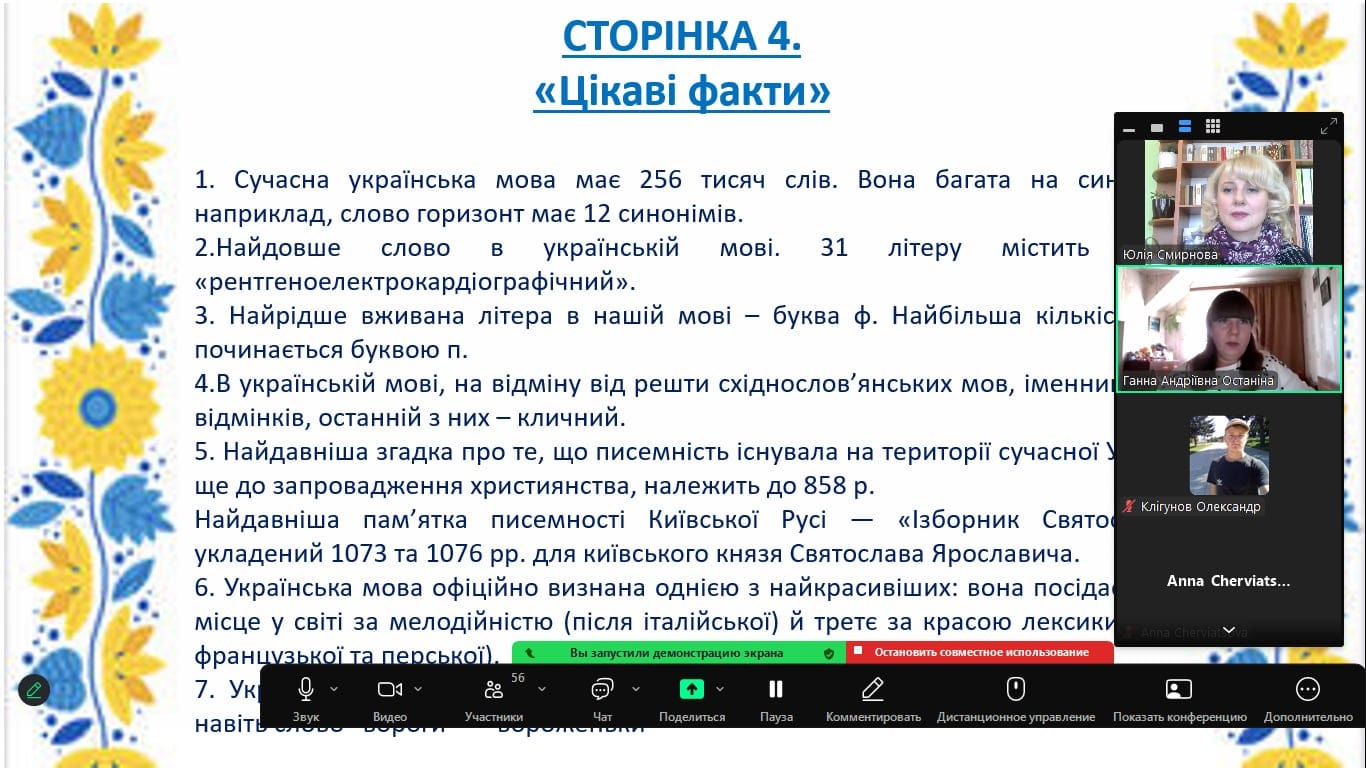 Напередодні Дня української писемності та мови бібліотекарі Наталія Пилипенко та Юлія Смирнова разом зі студентами першого курсу економіко-правового відділення та куратором Останіною Ганною Андріївною провели в онлайн форматі усний журнал "Мова - талісман людини та нації".