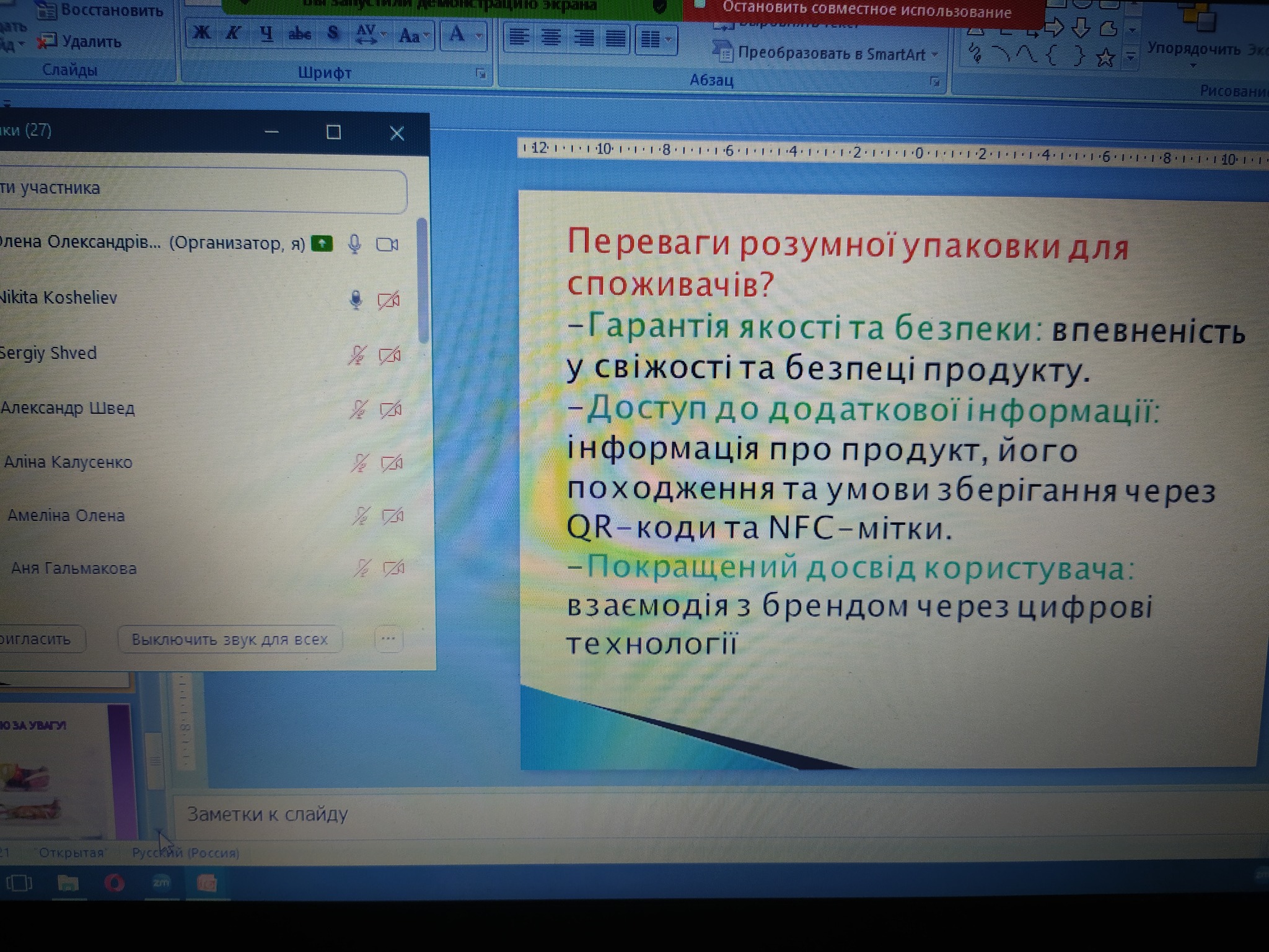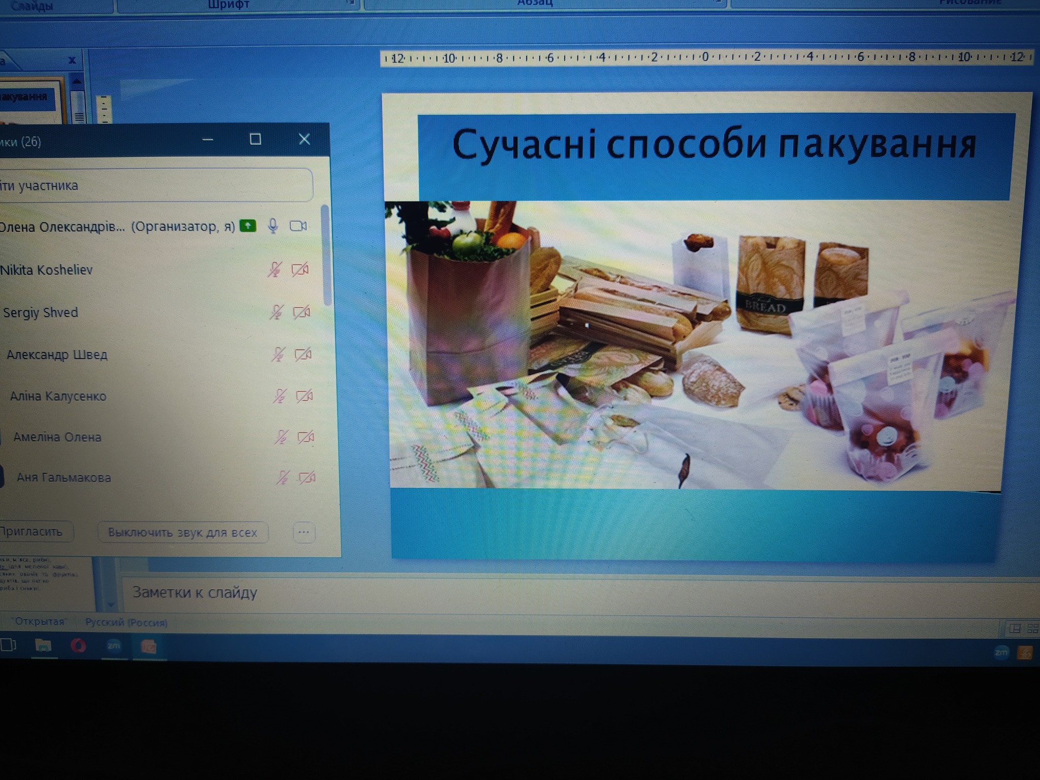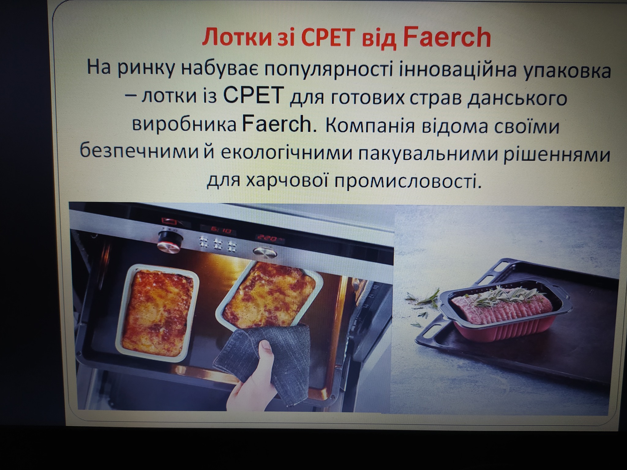 Разом зі студентами 4 курсу спеціальності "Харчові технології" провели конференцію на тему: "Сучасні способи пакування". Гальмакова Ганна ознайомила присутніх з пакуванням з опалого листя, переглянули відео про школяра-винахідника, Валентина Фречку, де він розповів, як виготовляє папір в лабораторних умовах з опалого листя. Калусенко Євген підготував цікаву інформацію про харчову та біорозкладну упаковку, навів приклади їстівних упаковок, розповів про застосування нанотехнологій у пакуванні харчових продуктів. Сергієв Іван доповів про пакування в модифікованій атмосфері. Кошелєв Никита ознайомив з активними системами пакування, сутністю розумної упаковки, її RFID та NFC- технології. Кузьменко Дмитро розповів про застосування інноваційної упаковки - лотків СРЕТ від Faerch для пакування готових страв, а також про сенсорні технології для упаковання - датчик для моніторингу стану упакованих швидкопсуючих харчових продуктів.