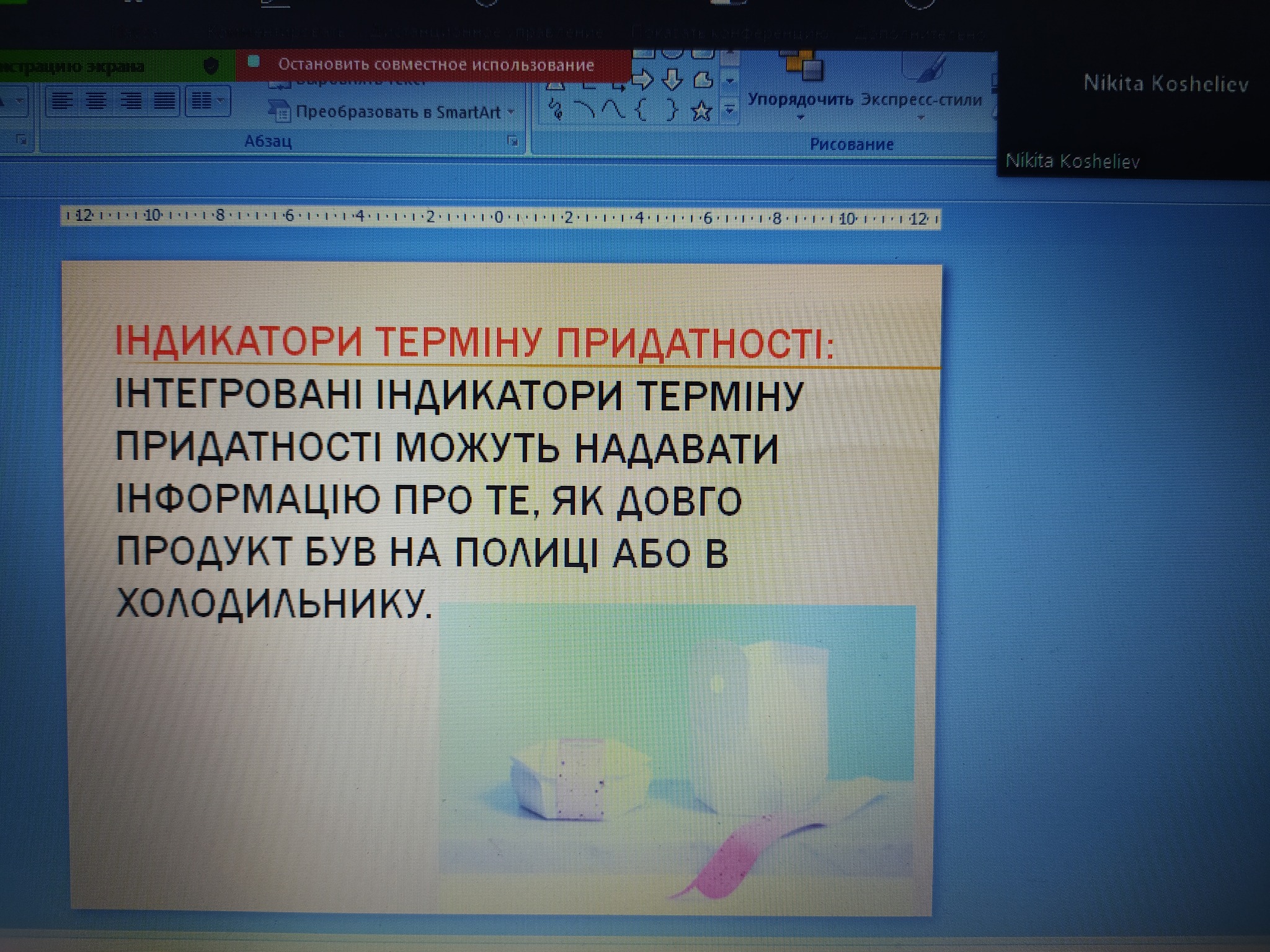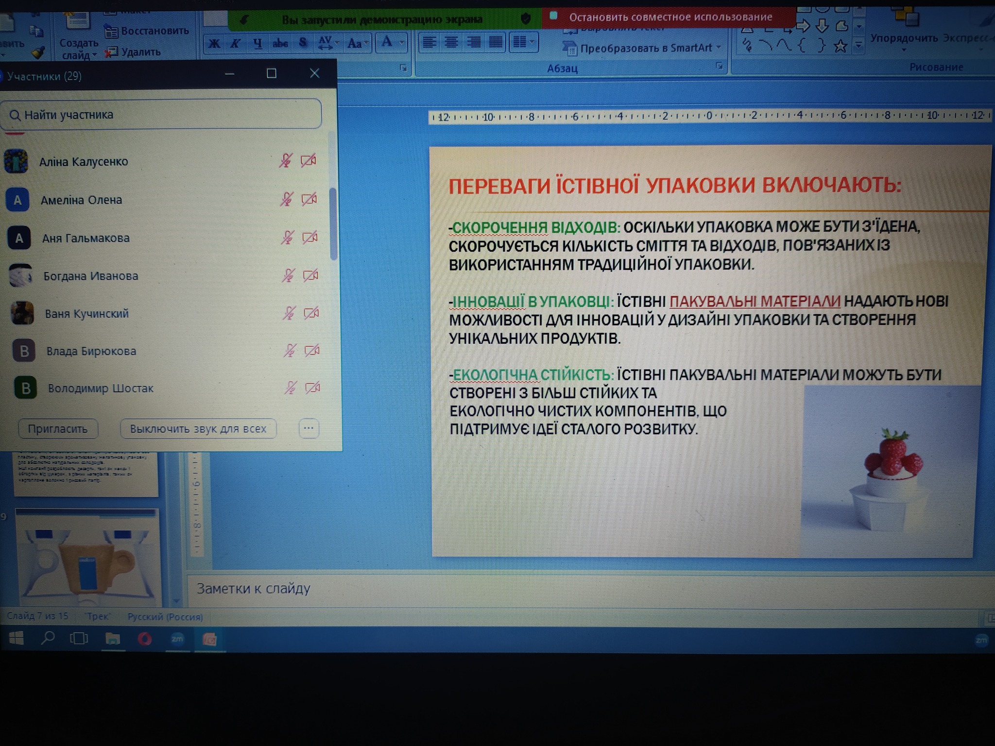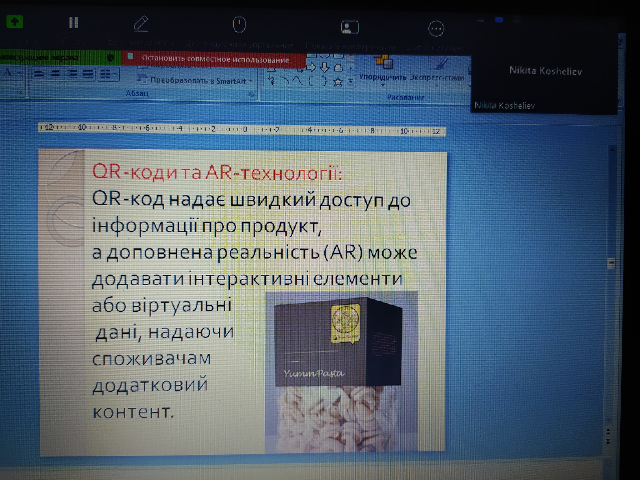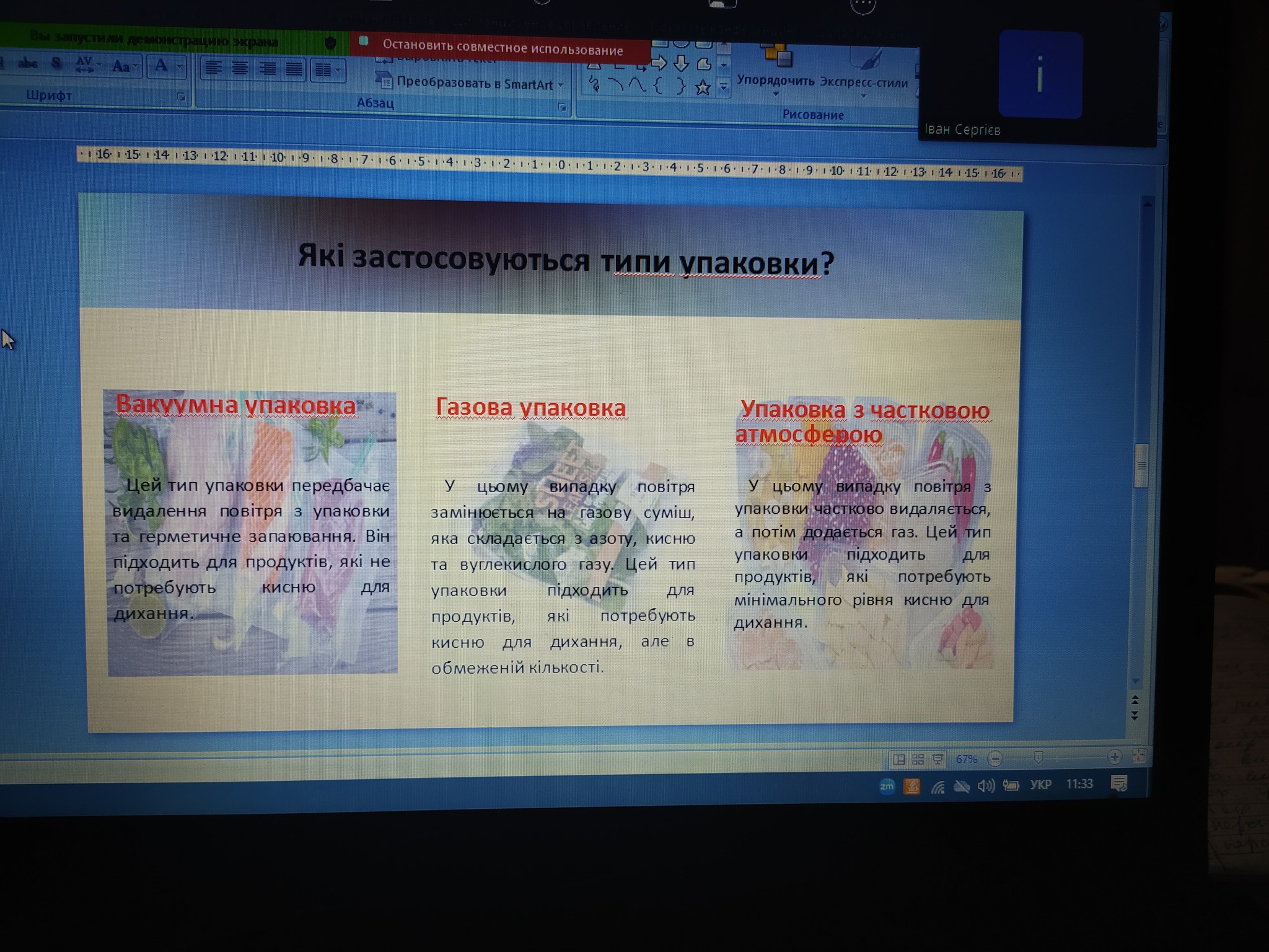 Разом зі студентами 4 курсу спеціальності "Харчові технології" провели конференцію на тему: "Сучасні способи пакування". Гальмакова Ганна ознайомила присутніх з пакуванням з опалого листя, переглянули відео про школяра-винахідника, Валентина Фречку, де він розповів, як виготовляє папір в лабораторних умовах з опалого листя. Калусенко Євген підготував цікаву інформацію про харчову та біорозкладну упаковку, навів приклади їстівних упаковок, розповів про застосування нанотехнологій у пакуванні харчових продуктів. Сергієв Іван доповів про пакування в модифікованій атмосфері. Кошелєв Никита ознайомив з активними системами пакування, сутністю розумної упаковки, її RFID та NFC- технології. Кузьменко Дмитро розповів про застосування інноваційної упаковки - лотків СРЕТ від Faerch для пакування готових страв, а також про сенсорні технології для упаковання - датчик для моніторингу стану упакованих швидкопсуючих харчових продуктів.