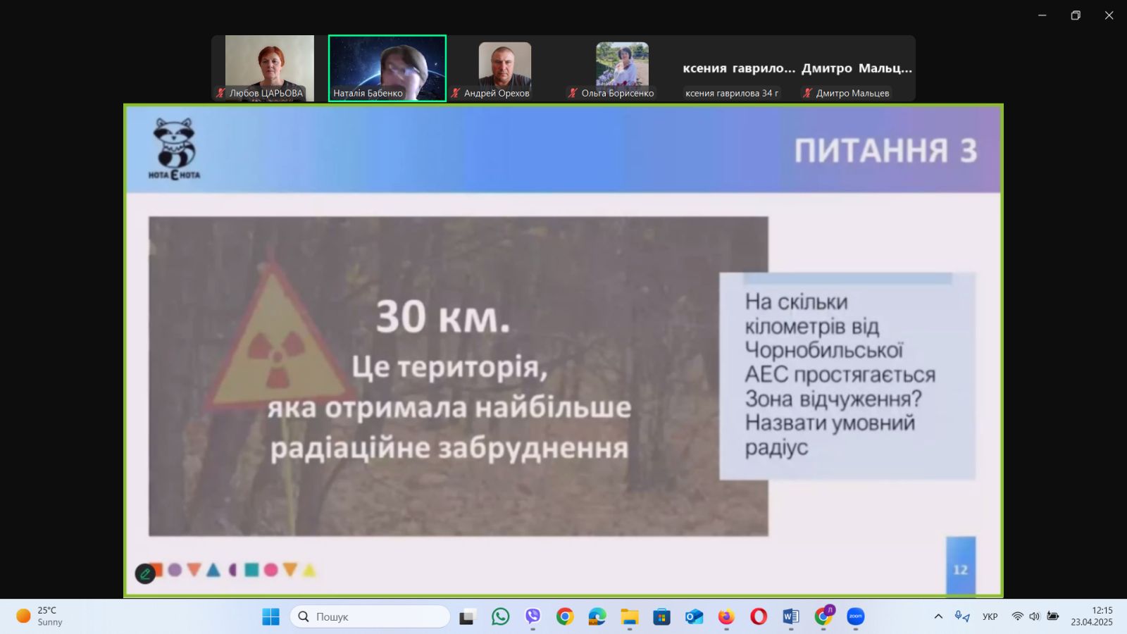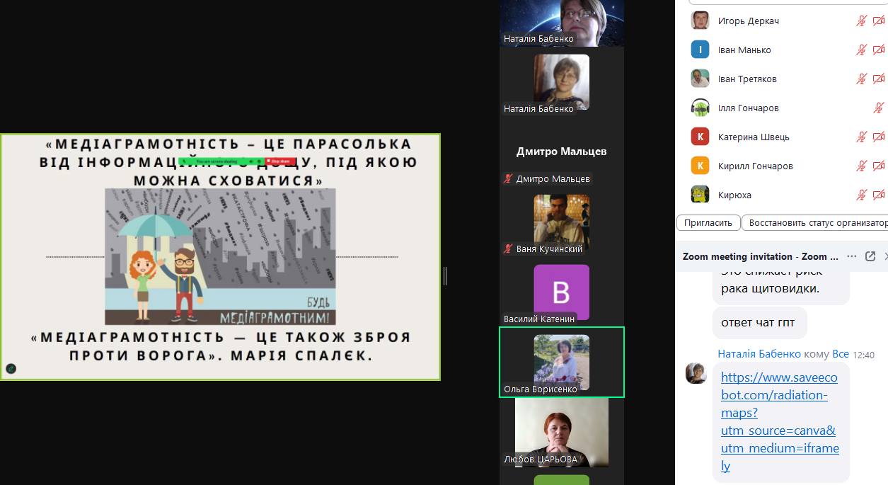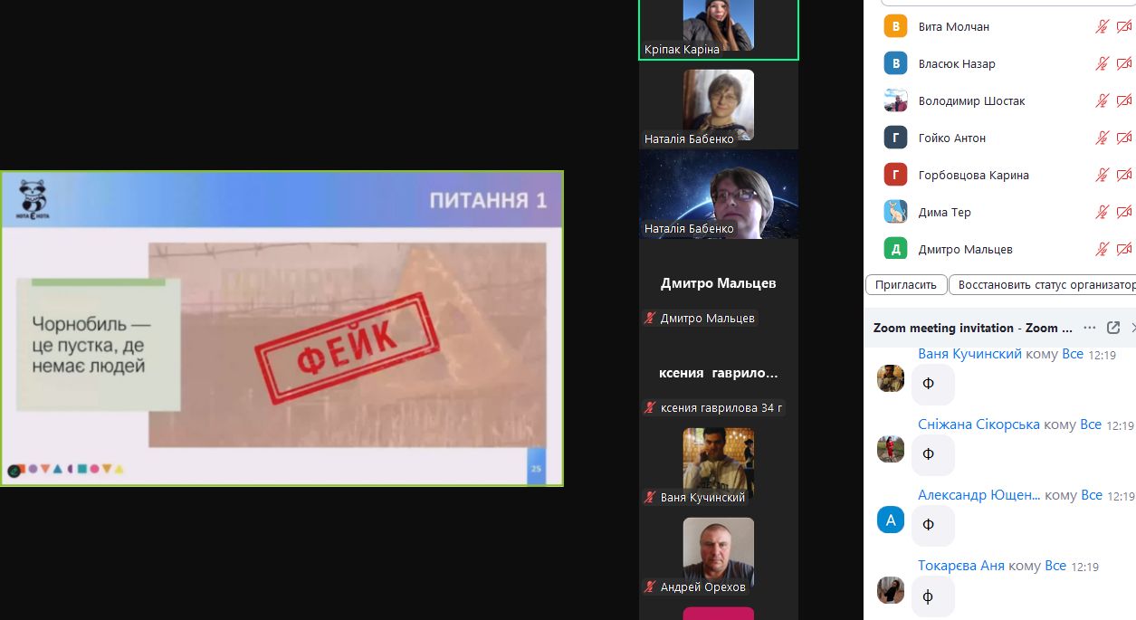 Студентка 34 групи Горбовцова Карина розповіла чому важливо бути медіаграмотним та як розрізняти фейки. Пограли у антифейкову інтелектуальну гру "НОТАЄНОТА". Гаврилова Ксенія і Кріпак Каріна розкрили фейки про Чорнобиль та радіацію. Куратор поділилася посиланням на сайт за допомогою якого можна дізнатися про радіаційний фон, забруднення повітря і води, пожежі.