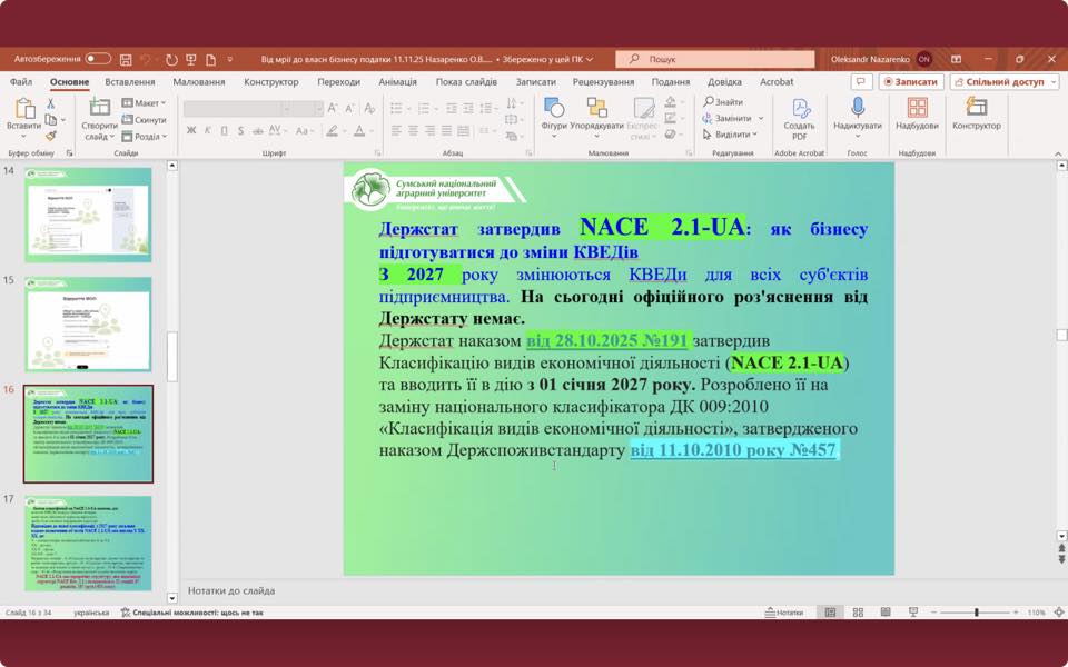 В рамках тижня обліково-економічних дисциплін у нас відбулась гостьова лекція д.е.н., професора кафедри обліку і оподаткування Факультет економіки і менеджменту Сумського НАУ Олександра НАЗАРЕНКА на тему «Від мрії до власного бізнесу: податки, які потрібно знати».