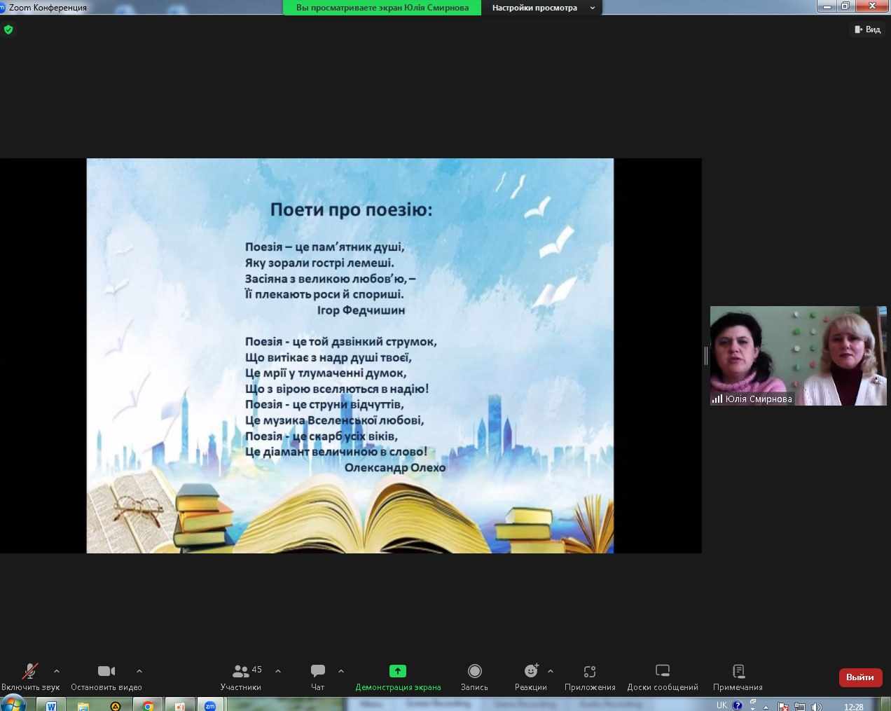 «Поетична година з елементами арт-терапії» - таку назву мав захід, підготовлений бібліотекарями Юлією Смирновою та Наталією Пилипенко разом зі студентами 18 групи відділення харчових технологій (куратор Олена Яроцька) та практичним психологом Оленою Вороновою, до Всесвітнього дня поезії. На онлайн-зустріч були запрошені студенти других курсів. Саме зараз по всій Україні проходить Національний тиждень читання. Тиждень поезії . Тема якого – «Дім».