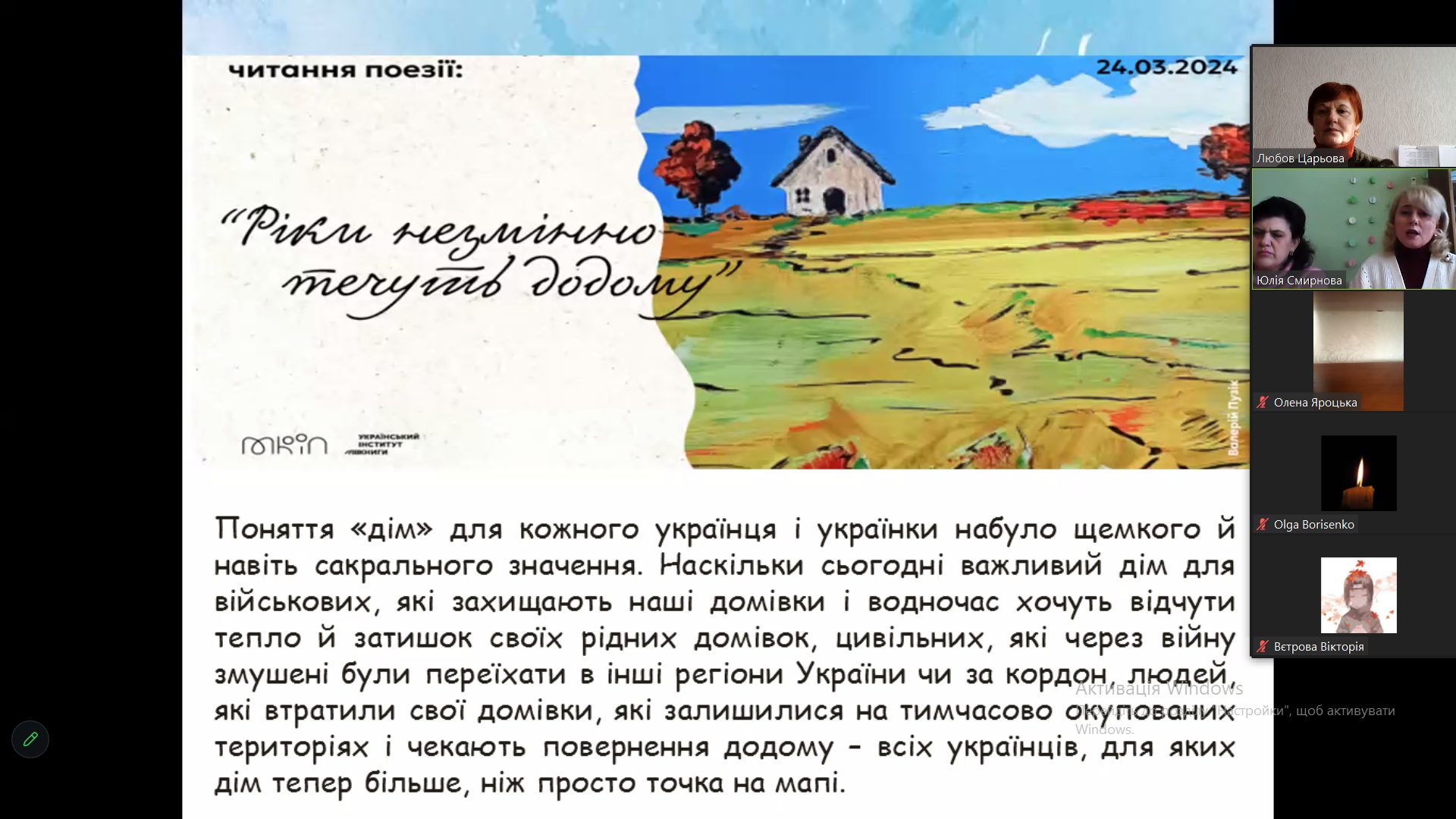 Студенти Зайцева Ліза, Приходько Захар, Гончаров Ілля та Грищенко Тетяна прочитали прекрасні, щемкі вірші присвячені батьківському дому, рідному краю. Дім тепер для кожного українця більше, ніж просто позначка на мапі. Не лише стіни і дах, але й місце - де насичені теплом спогади. Дім – це наша фортеця, наша родина . Досить болюча тема для молоді Сумщини, яка останнім часом потерпає від постійних обстрілів та бомбардувань. Тож, мистецтво поетичного слова має терапевтичний ефект.