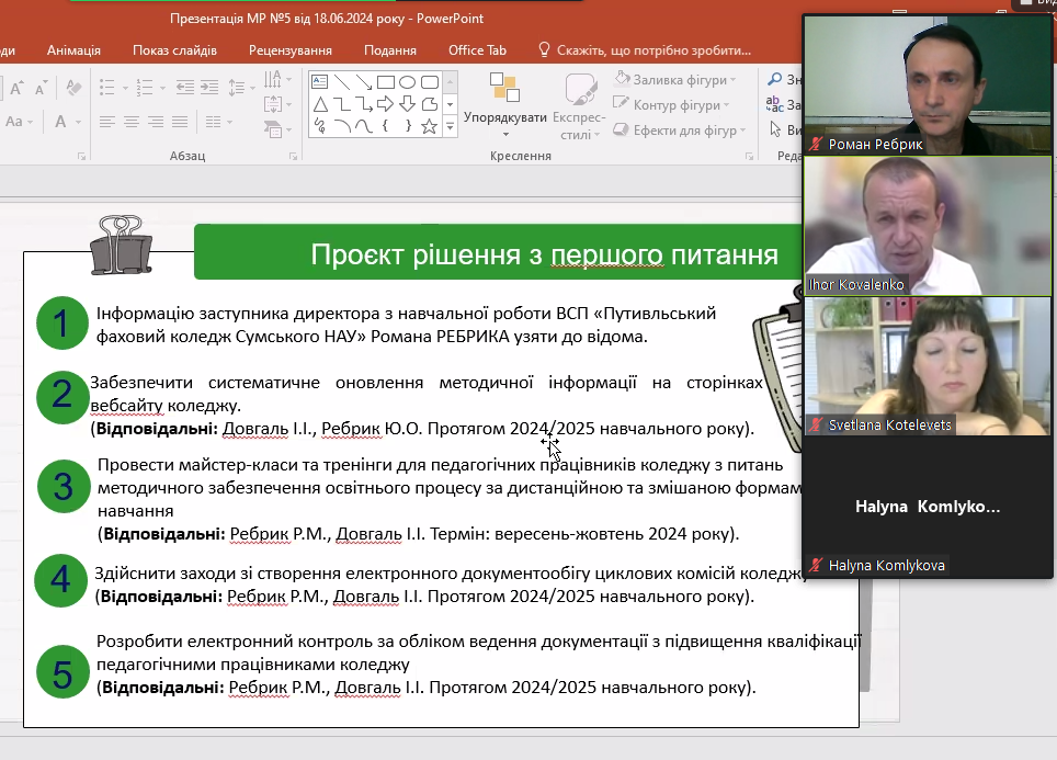 На методичній раді розглядалось питання «Про організацію методичної роботи у ВСП «Путивльський фаховий коледж Сумського НАУ». З інформацією виступив заступник директора коледжу з навчальної роботи Ребрик Р.М. У виступі Ребрик Р.М. детально зупинився на системі організації методичної роботи у коледжі, завданнях, що стоять перед методичним кабінетом та шляхи їх вирішення, окреслив проблемні питання.
