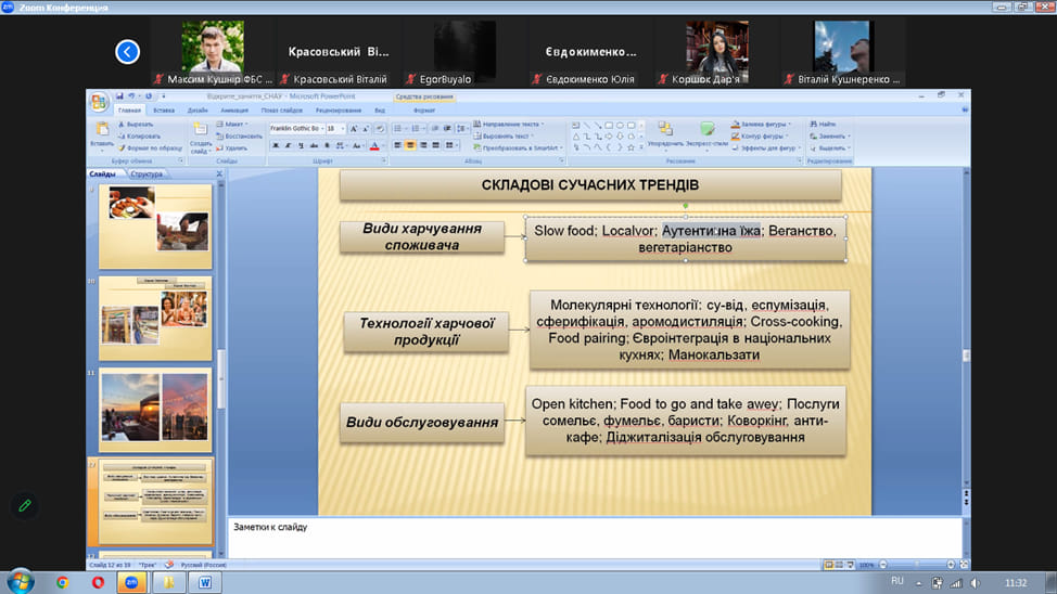 Студенти 21 – С групи спеціальності «Туризм і рекреація» ВСП «Путивльський фаховий коледж СНАУ» 3 жовтня 2024 року доєдналися до гостьової лекції СНАУ на тему: “Сучасні та інноваційні концепції закладів ресторанної індустрії України та країн Європи”. Лектор – Омельченко Світлана Борисівна, к.т.н., доц. кафедри харчових технологій в ресторанній індустрії ДБТУ. Під час заняття було розглянуто основні поняття та розвиток, динаміку, тренди сучасного стану у закладах ресторанної індустрії. Лекція проходила на платформі Zoom і супроводжувалася мультимедійною презентацією. Здобувачі освіти активно брали участь у дискусії, ставили питання та отримували ґрунтовні відповіді. Професійність і педагогічна майстерність лектора викликали значний інтерес серед студентів, що надихає на проведення подібних заходів у майбутньому.
