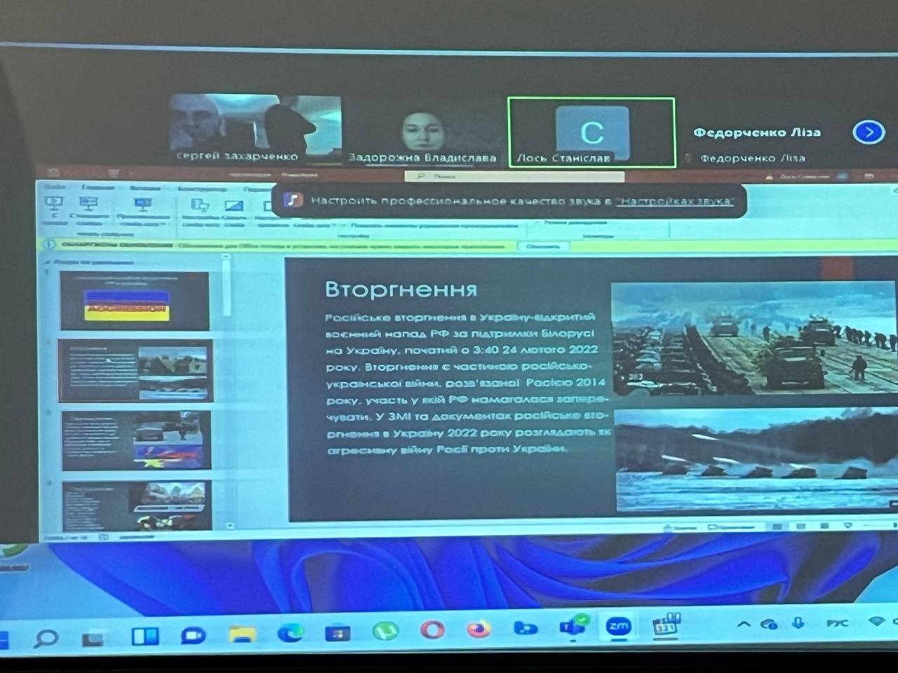 До річниці повномасштабного вторгнення Росії на територію України студентами 26 групи разом з куратором Захарченко С.М. була підготовлена і проведена виховна година на тему "Російсько-українська війна. Пам'ятаємо наших героїв". Студенти групи разом з куратором нагадали присутнім, які події відбувались на початку вторгнення,як українці гуртувалися, щоб дати достойну відсіч ворогу, через які випробування прийшлось пройти українцям за роки війни. Активну участь у підготовці заходу взяли студенти Лось С., Задорожна В. та інші. На зустріч із студентами був запрошений викладач коледжу, а нині військовослужбовець ЗСУ Лисов Віктор Іванович, який розповів про сьогодення українських воїнів та події, які відбуваються на фронті, відповів на численні запитання аудиторії. Як важко не було б зараз українському народу, пам'ятайте - ворога буде знищено, перемога буде за Україною!