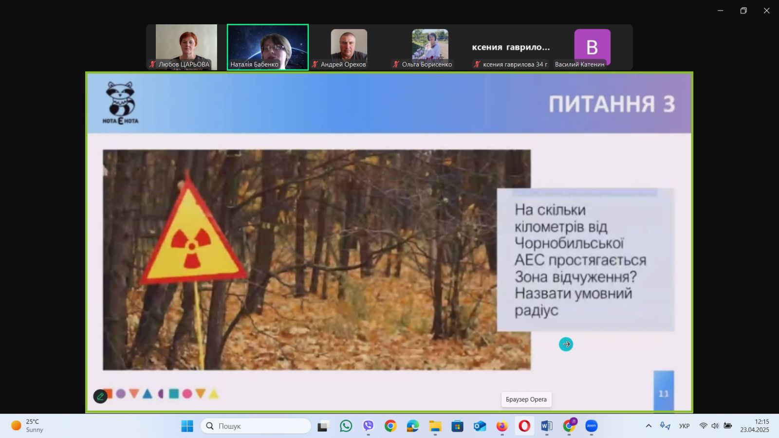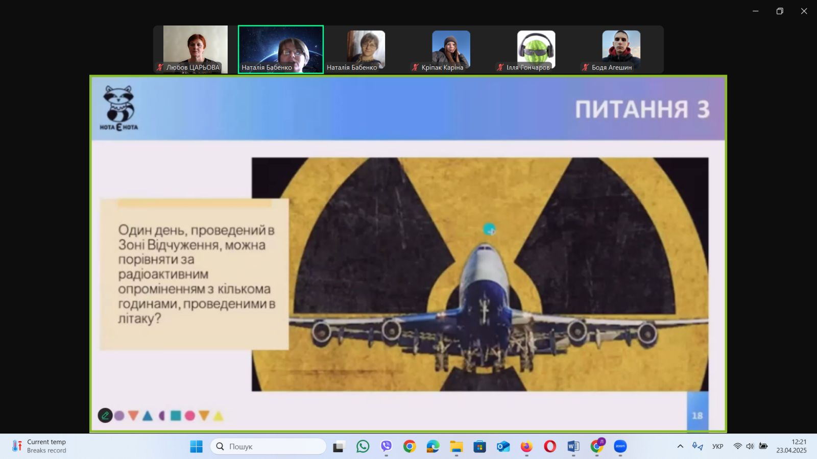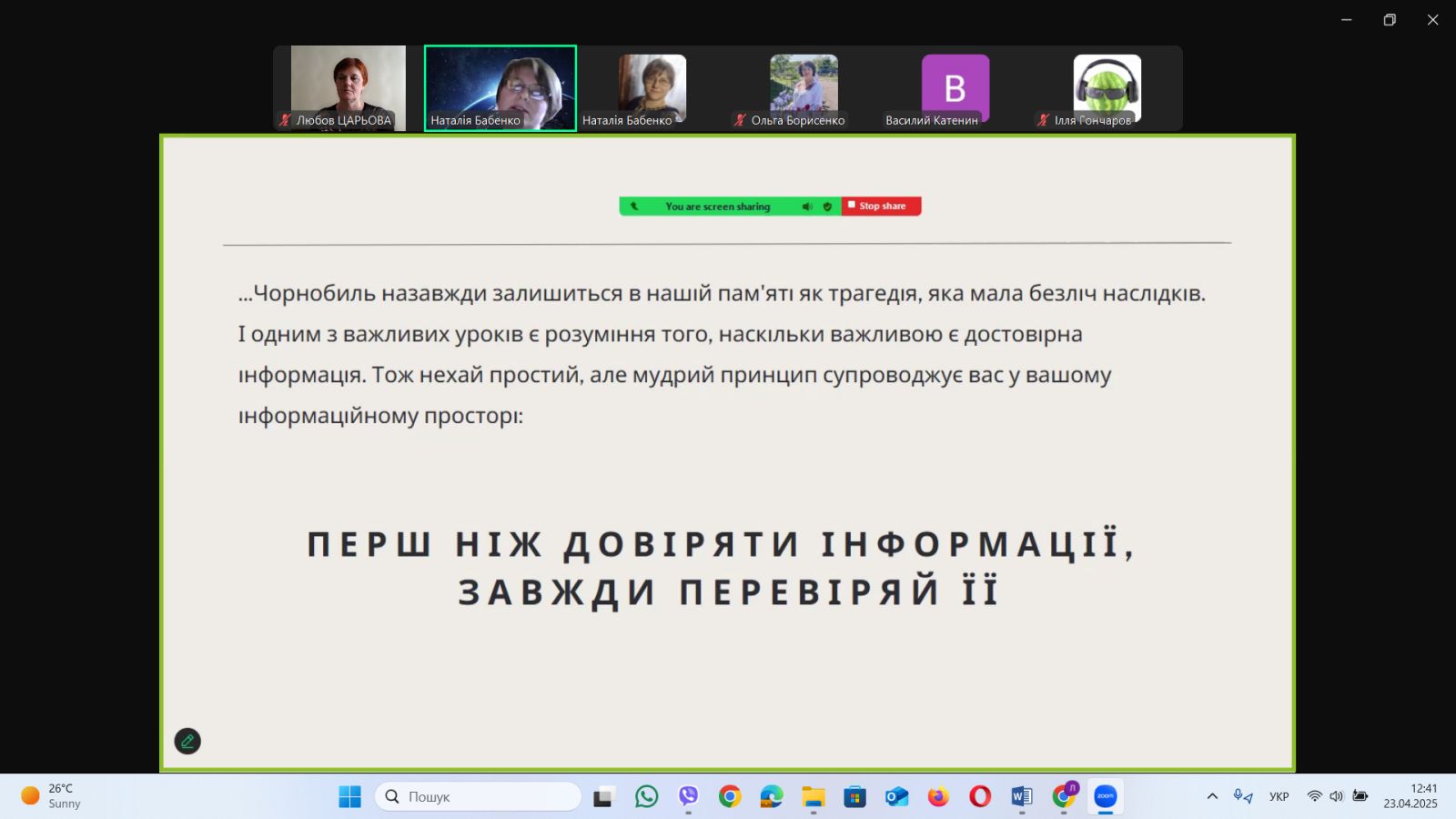 Студентка 34 групи Горбовцова Карина розповіла чому важливо бути медіаграмотним та як розрізняти фейки. Пограли у антифейкову інтелектуальну гру "НОТАЄНОТА". Гаврилова Ксенія і Кріпак Каріна розкрили фейки про Чорнобиль та радіацію. Куратор поділилася посиланням на сайт за допомогою якого можна дізнатися про радіаційний фон, забруднення повітря і води, пожежі.