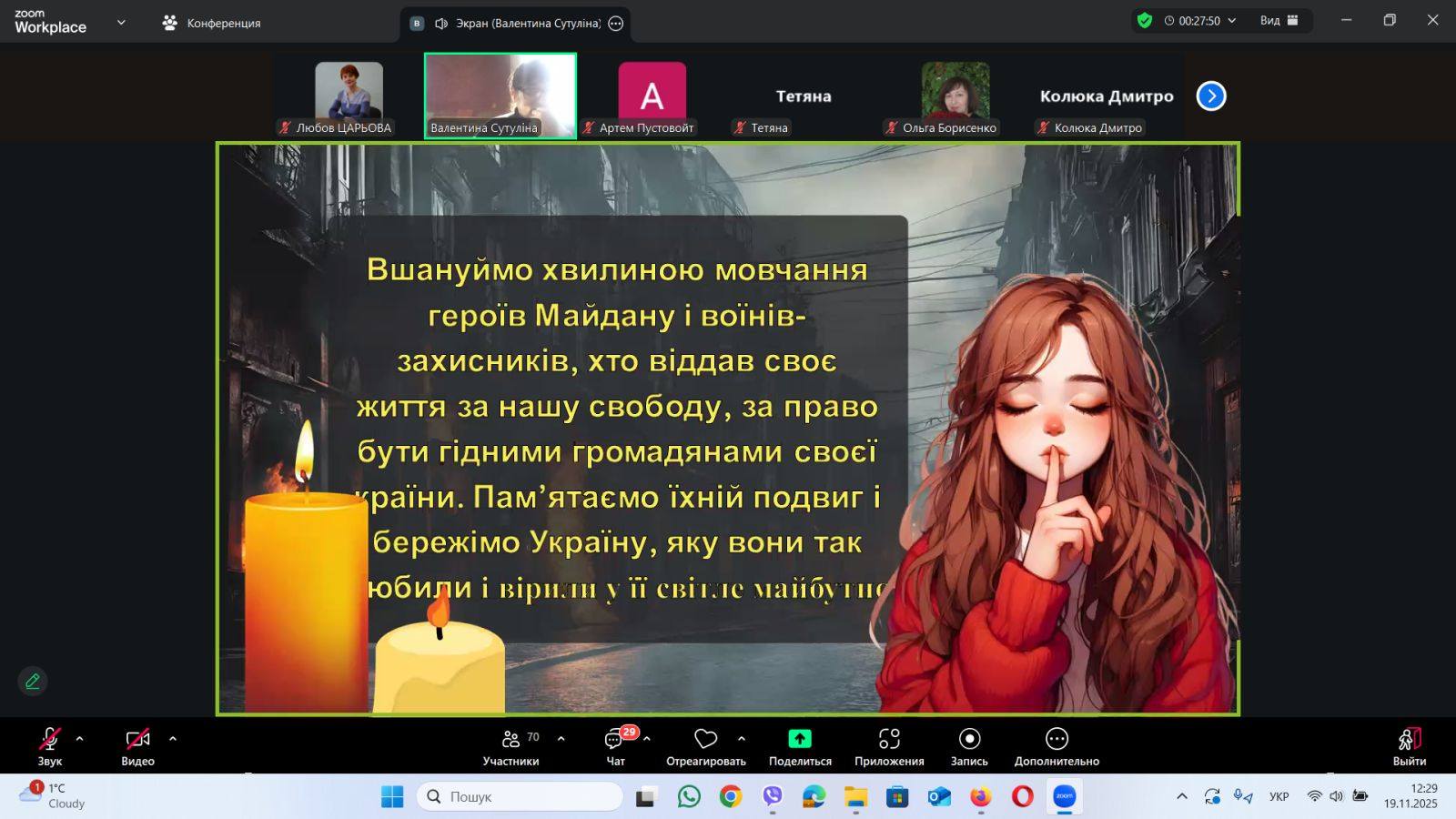 Сьогодні 28, 28П, 22 навчальні групи, разом з куратором Сутуліною В.Ю. провела надзвичайно важливу та зворушливу відкриту виховну годину, присвячену Дню Гідності та Свободи. Це не просто дата в календарі, це серце нашої нації, нагадування про ціну, яку ми платимо за право бути вільними. Ми почали з обговорення фундаментальних понять — свободи та гідності. Ці слова набули особливого, кривавого значення для України, ставши справжнім кодом нашої ідентичності. Провели глибокий екскурс у події, які передували встановленню цієї дати. Згадали Помаранчеву революцію та Революцію Гідності, нагадавши собі та присутнім про символи цих доленосних подій.
